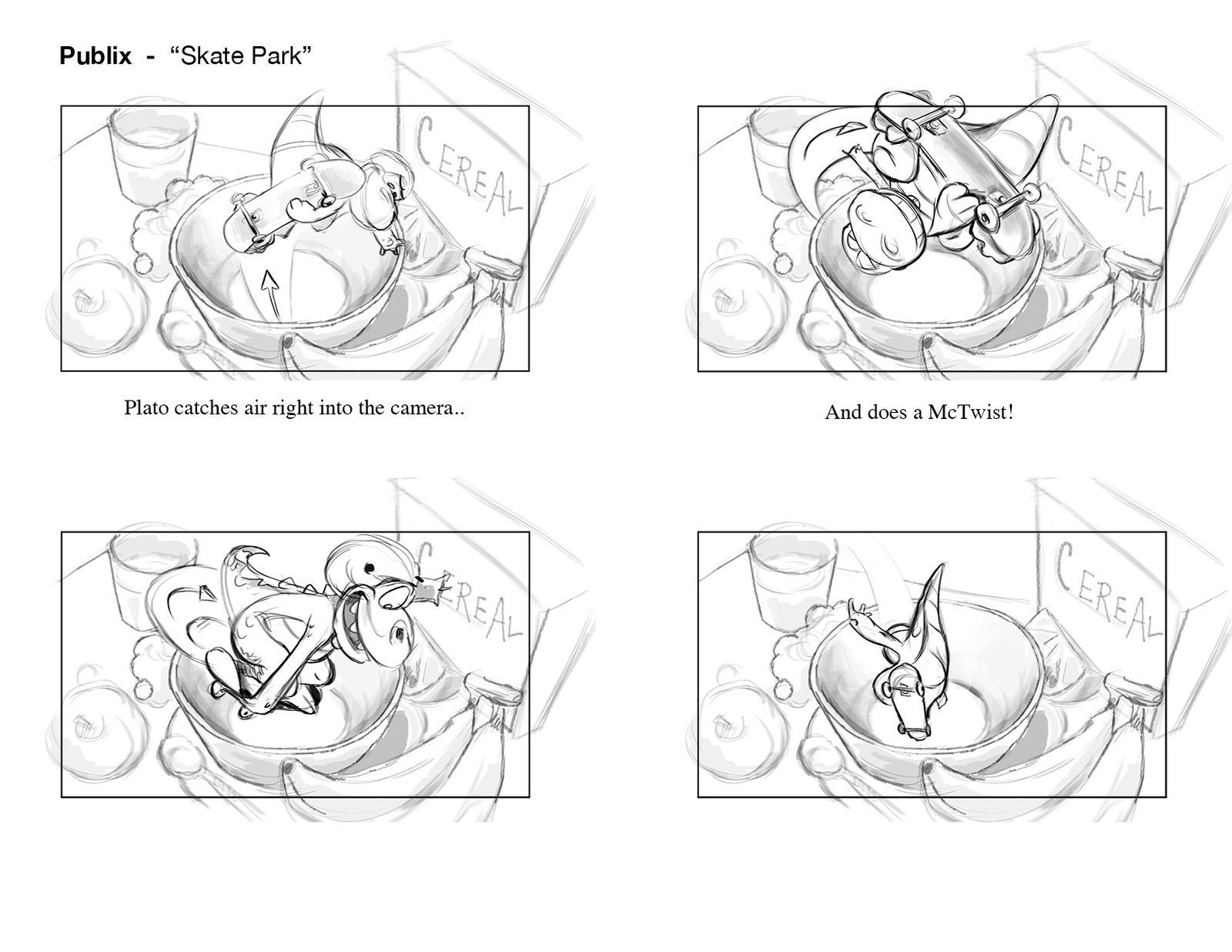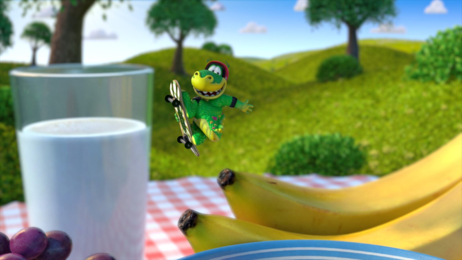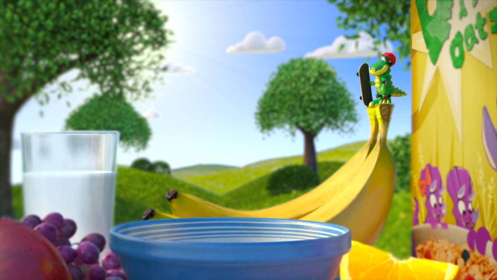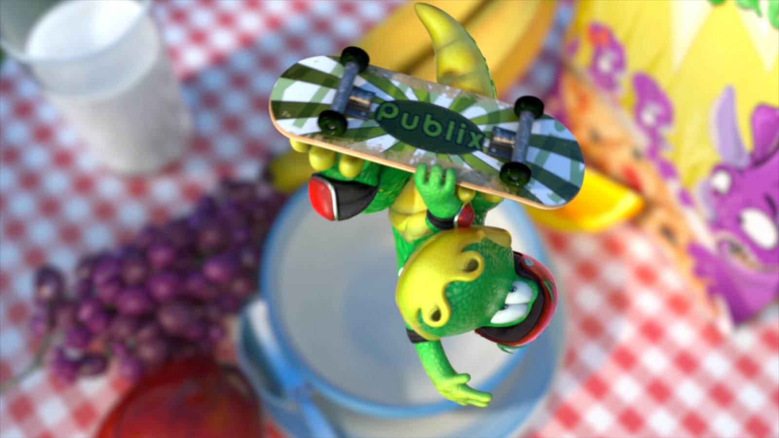 Plato shredding the bowl on his new Publix skateboard! An exciting part of this project was adapting Publix’s lovable “Plato” mascot to CG. Having already existed in previous commercials as a 2D character, there were certain characteristics that we needed to keep in tact, while developing his detail, expressiveness, and production quality significantly.