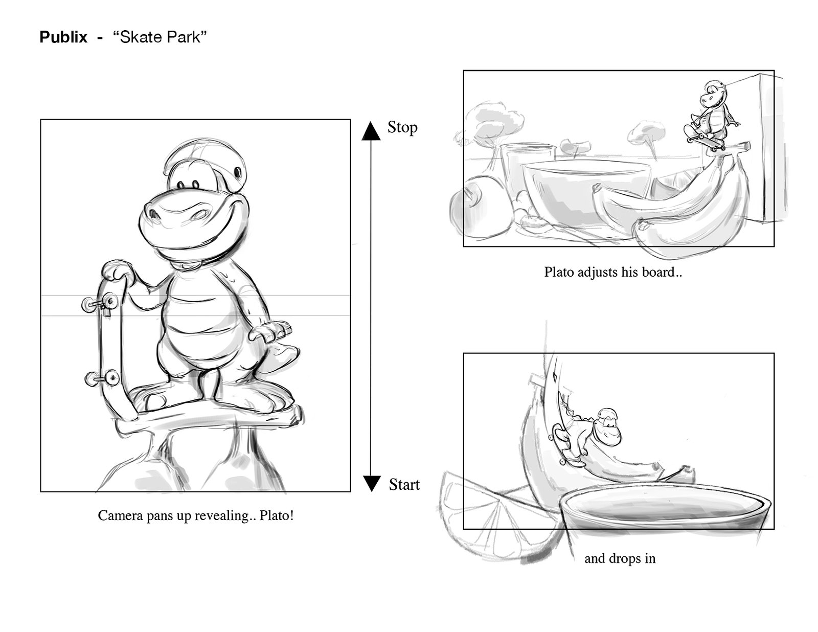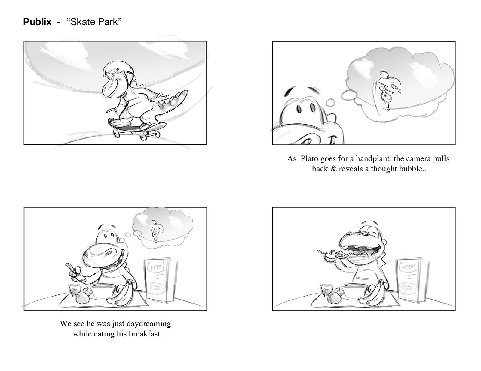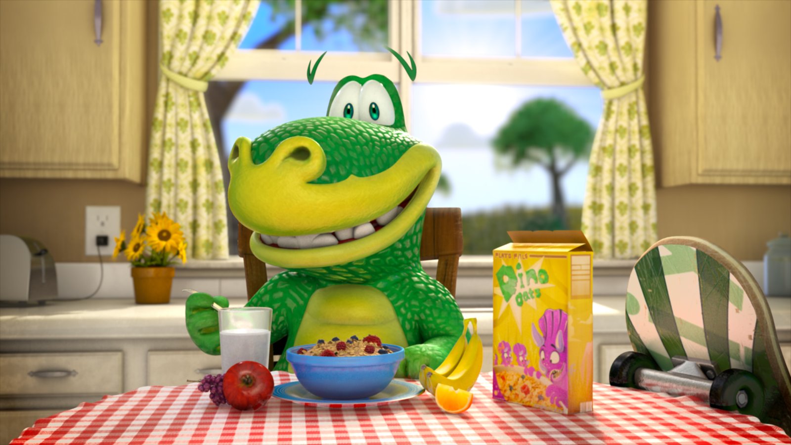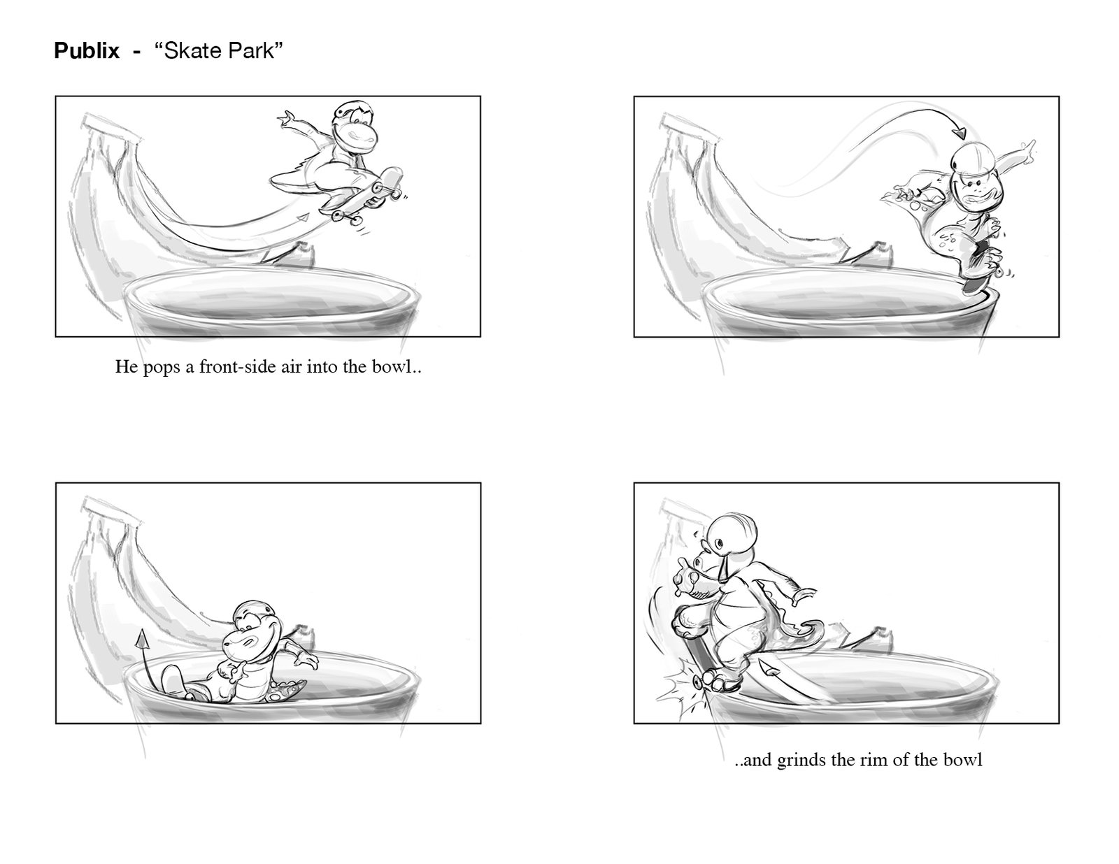Plato shredding the bowl on his new Publix skateboard! An exciting part of this project was adapting Publix’s lovable “Plato” mascot to CG. Having already existed in previous commercials as a 2D character, there were certain characteristics that we needed to keep in tact, while developing his detail, expressiveness, and production quality significantly.